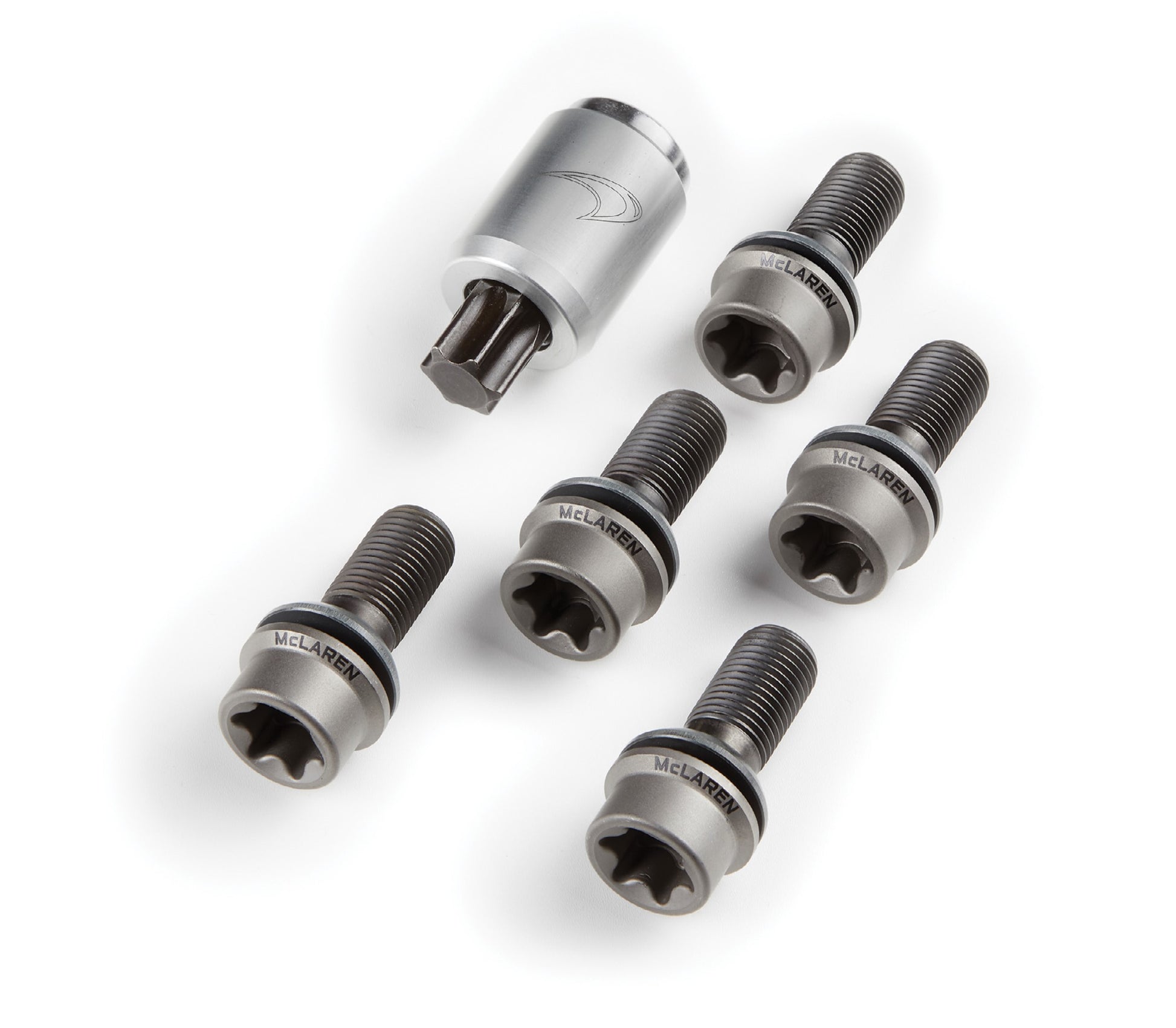Available exclusively as an accessory. Titanium wheel bolts offer a 35% reduction in weight compared to the standard Steel Wheel Bolts. Reduce weight in the most important area of the vehicle, decreasing both unsprung and rotating mass to further enhance the McLaren 720s dynamic prowess. Featuring subtle McLaren branding and an alternative torx head design, these are supplied as a car set of 20 bolts and accompanying tool featuring a laser-etched McLaren Speedmark.