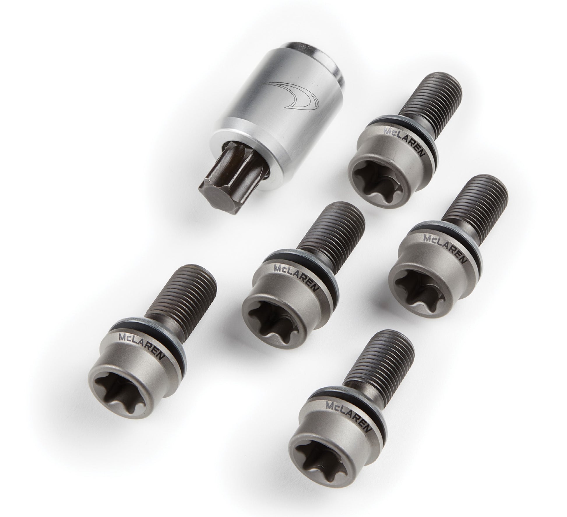 Available exclusively as an accessory. Titanium wheel bolts offer a 35% reduction in weight compared to the standard Steel Wheel Bolts. Reduce weight in the most important area of the vehicle, decreasing both unsprung and rotating mass to further enhance the McLaren Artura’s dynamic prowess. Featuring subtle McLaren branding and an alternative torx head design, these are supplied as a car set of 20 bolts and accompanying tool featuring a laser-etched McLaren Speedmark.