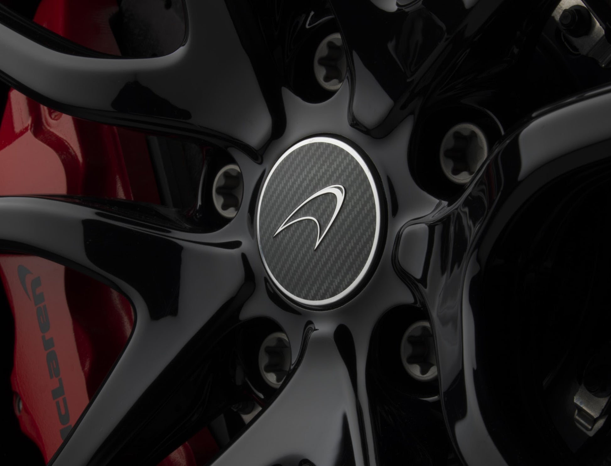 Available exclusively as an accessory. Carbon-backed to replace the standard wheel centre caps on the vehicle – incorporating the McLaren Speedmark in either Carbon or Red.